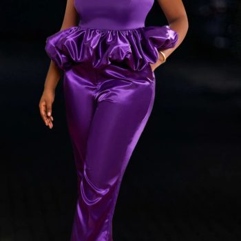 Fleepmart Women Two Pieces Set Purple Sexy Strapless Tube Tops Peplum Ruffles Wide Leg Pants Shiny Party Birthday Event Suit Summer New