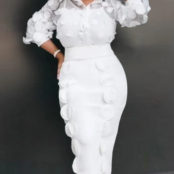 Fleepmart Women White Two Pieces Sets Sexy See Through Mesh Shirt Blouse Turn Down Collar Aplliques Half Sleeve High Waist Party Skirt New