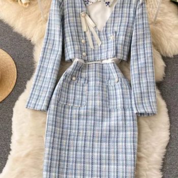 Fleepmart Two piece set Plaid lool sleeve Dress Fashion Vestidos Slim Party Club Summer Off Shoulder Hotsweet slip Dresses