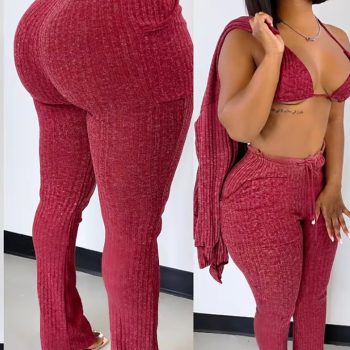 Fleepmart Solid Wool Knitted Rib 3 Piece Set Fall Winter Clothes for Women Casual Button Coat + Slit Flare Pants Tracksuit Women Sweatsuit