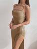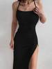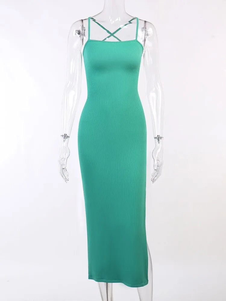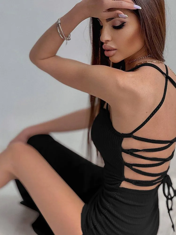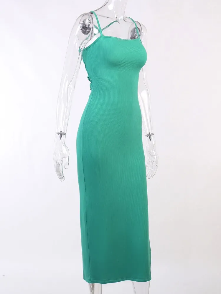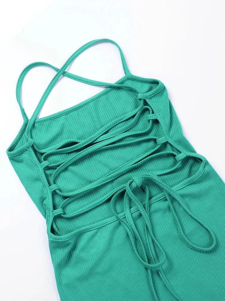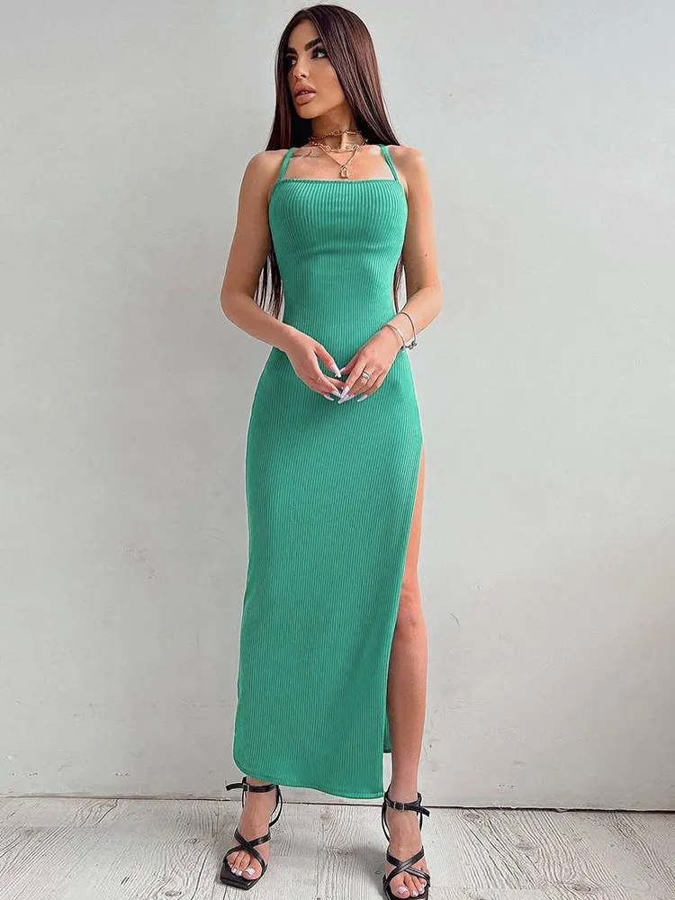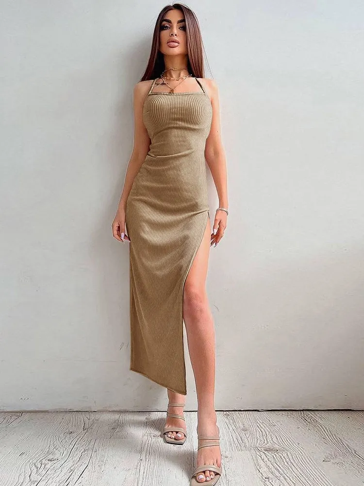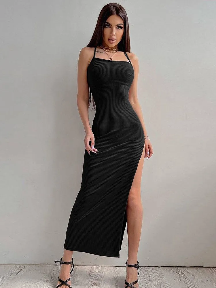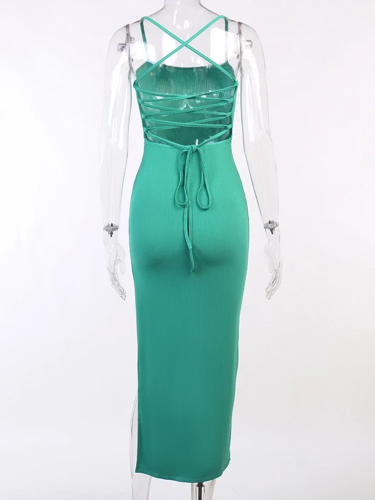 WannaThis Knit Backless Lace Up Sundress Women Sleeveless Bodycon High Split Ankle-Length Dresses Sexy Party Outfits Beachwear