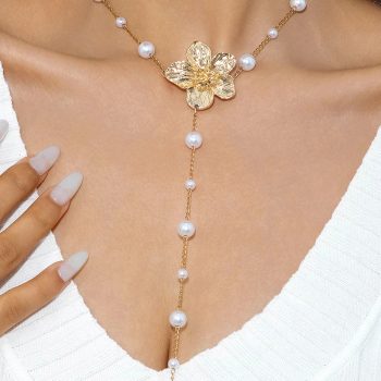 Fleepmart Elegant Long Tassel Imitation Pearl Flower Necklaces for Women Gold White Color Beads Pendants Necklaces Fashion Jewelry