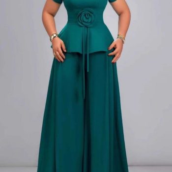 Fleepmart Elegant Women Green Two Pieces Set O Neck Short Sleeve 3D Flower Peplum Wide Leg Full Length Pants Office Lady Party Outfit New