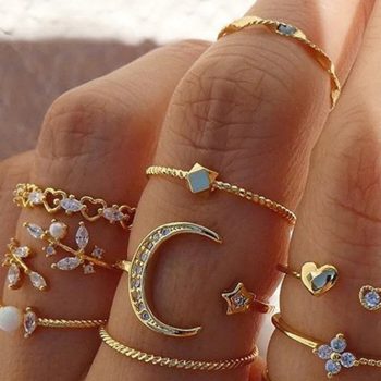Fleepmart Fashion Vintage Gold Crystal Star Moon Knuckle Ring Set For Women Bohemian Geometric Flower Alloy Charm Ring Jewelry Gift