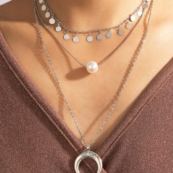 Fleepmart Vintage Silver Color Moon Bull Head Multi Layer Necklace for Women Pearl Geometric Sequins Tassel Choker Jewelry Collar
