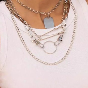 Fleepmart Goth Multi Layer Safety Pin Key Chains Necklaces for Women Punk Geometric Tag Pendant Necklace Gothic Jewelry Gift 2024