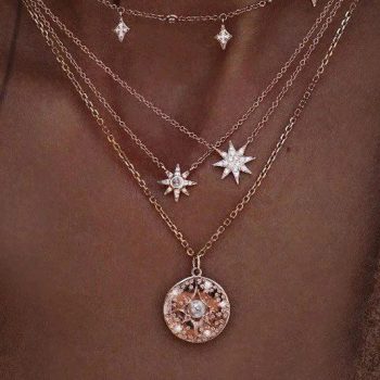 Fleepmart Boho Shiny Crystal Gem Round Stars Pendant Multilayer Chain Necklace Charm Pearl Gold Color Chain Party Jewelry Gift