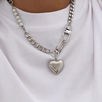 Fleepmart Punk Stainless Steel Heart Pendant Necklace for Women Kpop Steel Ball Lock Key Chain Necklace Gothic Jewelry Gift 2024