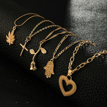 Fleepmar Punk Gold Color Long Leaf Cross Rose Flower Heart Multi Layer Pendant Necklace For Women Vintage Choker Jewelry