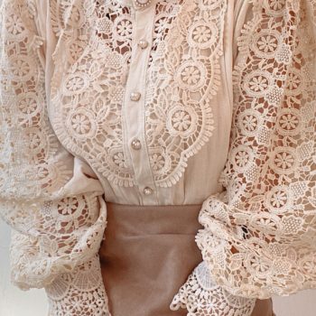 Fleepmart Petal Sleeve Stand Collar Hollow Out Flower Lace Patchwork Shirt Femme Blusas All-match Women Lace Blouse Button White Top