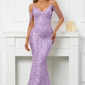 Fleepmart Women Pink Sequin Dress Strap Beading Party Maxi Dress Sexy V Neck Evening Dress Long Prom Dress