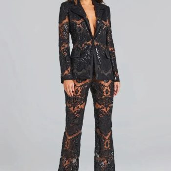 Fleepmart Black Lace Mesh Embroidered Sequin Pant Sets White New Designer Sequins Blazer Pants Set 2 Pieces Pants Suits Punk Suit Outfis